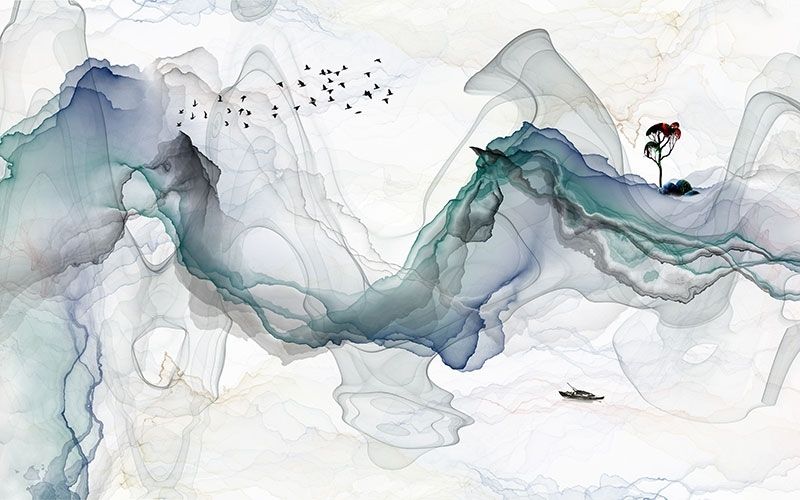 Add a touch of serenity and artistry to your space with the Abstract Colorful Smoke with Tree Wallpaper Mural. Flowing waves of soft teal, grey, and smoky blue swirl effortlessly across a light, textured background, creating an ethereal landscape. A lone red-leafed tree and delicate birds add striking contrast, making this design both peaceful and dynamic. Perfect for living rooms, offices, or bedrooms, this modern wallpaper evokes a calming yet sophisticated atmosphere. It’s a stunning choice for anyone looking to elevate their walls with a blend of abstract art and natural elegance.