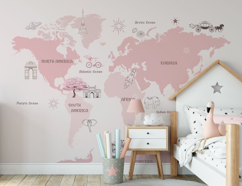 Your little one is going to fall in love with our pinky and charming For Girls Pink Monochrome World Map Wallpaper Mural. This beautiful wallpaper mural details animated motifs in their native regions as they are found. You can be sure that your children will both admire and learn about countries of the world. Also, this soft pink color gives a positive effect to your kid's room. This cartoon map is such a stylish wallpaper that your children will have fun spending time there. This miracle wallpaper is ideal for especially girl's bedrooms and, you can also use it in any child's space, nursery room, and playroom.