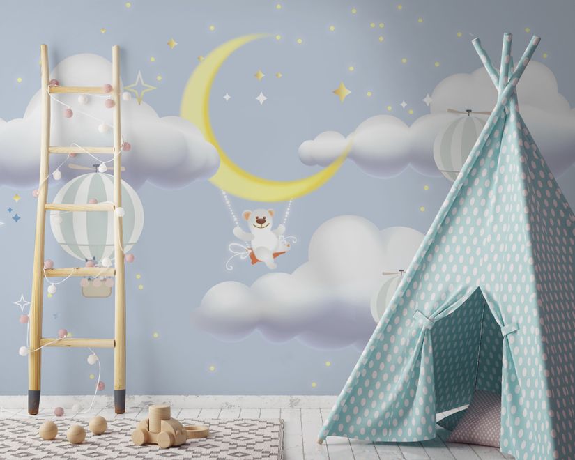 Your little one will get lost among this fluffy cloud and moon. Our Kids Cartoon Cloud and Yellow Moon Wallpaper Mural features clouds like cotton and flying cute hot air balloons. Also, in the middle of the wallpaper, there is an adorable swinging bear on the moon. All of these dreamy elements create a happy atmosphere that also improves their imagination. All elements will capture your kid's attention when you place this wallpaper in the bedroom, nursery room, or playroom. Moreover, this chic wallpaper works well in any color decor or furnishings. Then, it is time to create a positive aura for your kid.