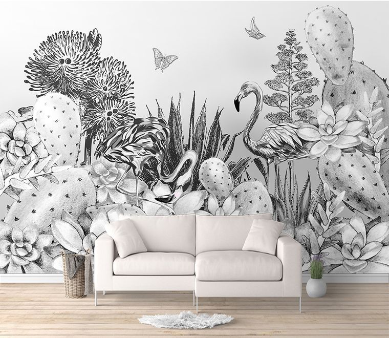Add artistic sophistication to your space with our Monochrome Cactus Floral with Flamingo Drawing Wallpaper Mural. This striking black and white wall mural features an expertly illustrated desert scene, where elegant flamingos stand gracefully among succulent gardens and prickly pear cacti. Delicate butterflies float above the detailed botanical illustration, while each pencil stroke brings the composition to life with remarkable depth and texture. Perfect for modern homes, creative studios, or contemporary offices, this wallpaper mural combines whimsical elements with botanical precision. The monochromatic palette ensures versatile styling options while maintaining visual interest through intricate linework.