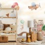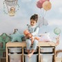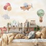 Nurseries and kids’ bedrooms work well with softer palettes and open sky around the motif. Playrooms handle bolder clusters. In living rooms or hallways, choose refined styles such as vintage airships or map details so the look reads more grown-up.
