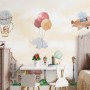 Choose a light ground, moderate spacing, and limit strong accent colors to a few balloons. Align seams so strings and clouds read as a single flow, and keep nearby textiles mostly solid to let the print lead without crowding the room.