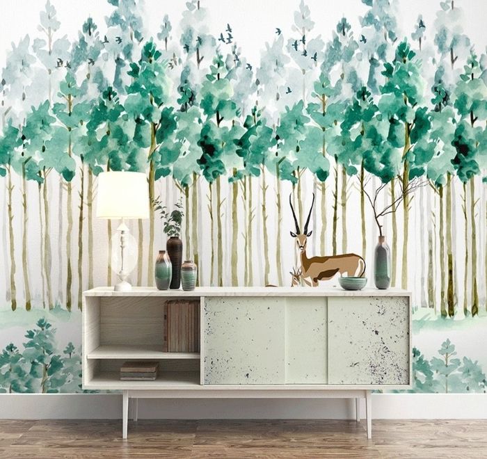 Bring the serenity of nature indoors with our Wallpaper Mural Watercolor Green Forest with Elk. This enchanting wall mural captures the magical essence of a misty forest scene, where graceful elk wander among tall, ethereal trees rendered in soothing shades of green and teal. The delicate watercolor technique creates a dreamy, atmospheric effect that transforms any room into a peaceful woodland retreat. Perfect for bedrooms, living spaces, or home offices, this premium wallpaper combines artistic sophistication with natural beauty. The soft, harmonious color palette and Nordic-inspired design make this wall mural an ideal choice for creating a calming, biophilic environment in your contemporary space.