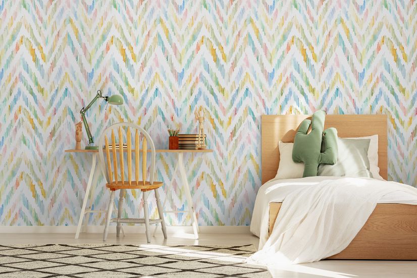 Add a touch of artistic elegance to your walls with our Watercolor Multicolor Chevron Ikat Design Art Wallpaper Mural. This ethereal wall mural features a delicate chevron pattern rendered in soft watercolors, blending gentle pastels of mint, coral, sky blue, and sunshine yellow. The hand-painted effect creates a dreamy, fluid aesthetic that brings both sophistication and whimsy to any space. Perfect for nurseries, living rooms, or creative spaces, this wallpaper mural offers a contemporary take on traditional ikat patterns. The airy design and soft color palette create a soothing atmosphere while adding visual interest through its artistic interpretation.